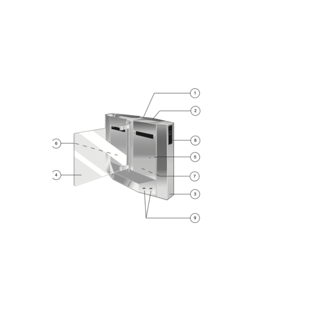 Bastidor autoportante de alta rigidez, integrando accionamiento electromecánico, sensores de seguridad de paso de los usuarios y centralitas electrónicas 2 Paneles laterales en el lado opuesto al obstáculo fabricados en acero pintado 3 Trozos delantero y trasero fabricados en acabado cepillado de 1,5 mm de espesor 1 2 8 5 7 3 9 Hoja de acero inoxidable AISI 304L 4 Obstáculo de cristal de seguridad templado transparente de 12 mm de espesor 5 Puertas de acero inoxidable AISI 304 acabado cepillado 6 Montaje electromecánico 7 Lógica de control programable que asegura el funcionamiento del motor 8 Pictograma de orientación al usuario 9 celdas de protección